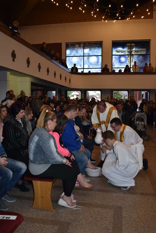 “Večeras je Isus sa svojom obitelji, sa svojim učenicima.....Gesta pranja nogu posebno upada u oči večeras, Isus pere noge svojim učenicima. To je gesta koja je pripadala u Isusovo vrijeme robovima. On postaje sluga. Nama kojima je teško služiti u svojoj kući, a da ne govorimo dalje. U ovoj svetoj noći vidimo istinsku narav čovjeka da odbaci Boga onako kako mu se on nudi, Bog koji je sluga. ..Pranje nogu suprotstavlja se i Judinoj i Petrovoj logici ljubavi. Isus silazi da bi nas spasio” rekao je među ostalim u propovijedi, naš župnik Ivica Martić. Misno je slavlje pjevanjem pratio Mješoviti zbor naše župe.