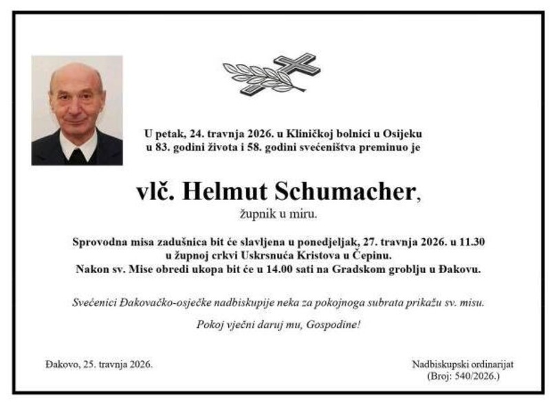 Umirovljeni svećenik Đakovačko-osječke nadbiskupije vlč. Helmut Schumacher preminuo je u petak, 24. travnja, u Kliničkoj bolnici u Osijeku, u 83. godini života i 58. godini svećeništva, izvijestili su iz Đakovačko-osječke nadbiskupije.